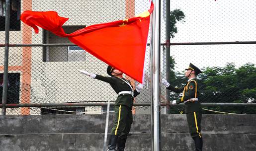 在雄壮的国歌声中,国旗护卫队的旗手庄严地升起了鲜艳的五星红旗。