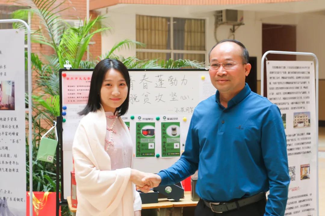 “小茶同学”大学生创业项目负责人巫泽慧同学介绍了项目创建与运营情况。2019年,巫泽慧同学联合当地大学生组建“小茶同学”青年创业团队,入驻beat365在线唯一官网帽峰创谷。该团队从广东饶平县特色茶产业发展状况出发,将茶农滞销十几年的老枞茶结合本地丰富的蜂蜜资源,创新性制成“蜜罐凉茶”、以及四季茶为主的“单丛茶袋泡茶”、“鸭屎香奶茶”等茶叶延伸产品,采用“农户+合作社+电商+品牌”的运营模式,通过校园合作、校企联盟形式打造原创品牌,共签约合作茶农30余户,累计帮扶售出茶叶3万余斤。疫情期间推出家庭罐装茶,通过新零售方式先后在潮州市13家超市上架,一定程度上解决了当地茶叶销售难、效益低的问题,助力饶平县脱贫攻坚。该项目入选共青团广东省委“青创100”企业。