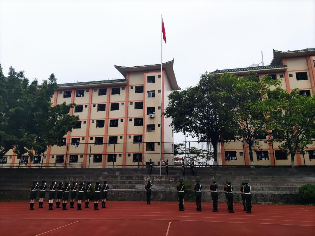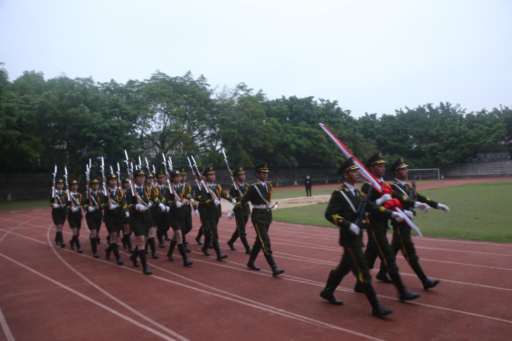 早上七点,东方欲晓、晨曦微露,全场师生精神抖擞,奏唱着雄壮的国歌,注视国旗护卫队的旗手缓缓升起鲜艳的五星红旗。
