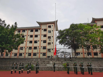 7:00整,在全体师生的注目礼下,英姿飒爽的国旗护卫队队员护送鲜艳的五星红旗进场。伴随着庄严的《中华人民共和国国歌》,五星红旗冉冉升起,迎风飘扬。