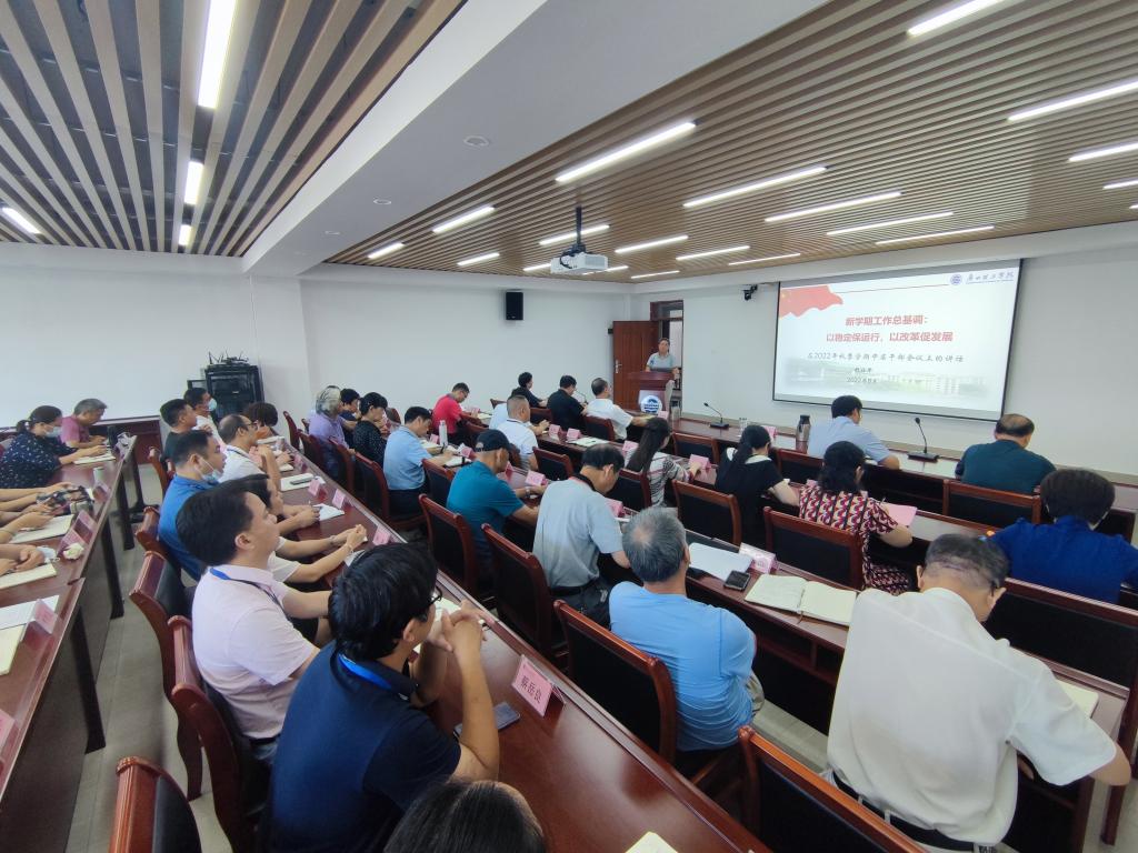 (黄菲青)8月24日,学校在行政楼召开新学期第一次中层干部会议,共谋事业新发展。全体党政领导和机关部处、二级学院党政干部参加了会议。校长胡社军主持并讲话,党委书记黄圣诚,常务副校长伏焕昌,党委副书记、纪委书记、副校长、工会主席胡思虎,党委副书记、副校长肖海,副校长张世梅分别部署了主分管工作。