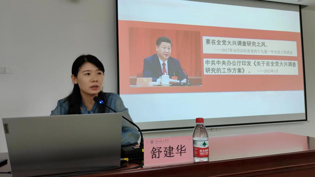 舒建华教授以习近平总书记关于调查研究的重要论述为切入点,运用翔实生动的案例和结合自身多年来从事调查研究的经验和体悟,从“认识调查研究的重要意义”“掌握调查研究的科学方法”“加强调查研究的作风建设”三个方面深入分析和深刻阐释调查研究的意义、价值、内涵、途径和方法。她指出,调查研究是一个推动工作、自我学习提高、联系群众,为民办事的过程,要提前做好调查研究各项前期准备工作,同时还要做到既要“身入”基层,更要“心到”基层,听真话、察真情,真研究问题、研究真问题。