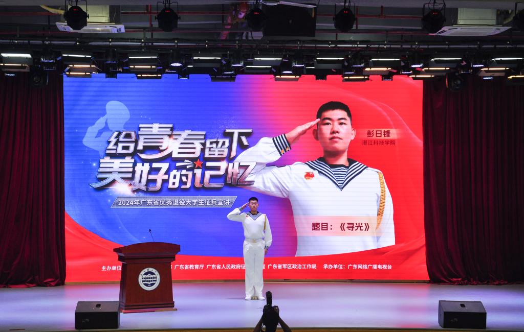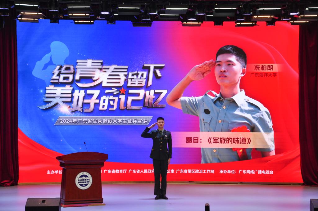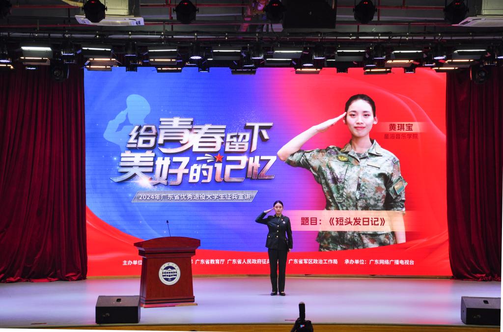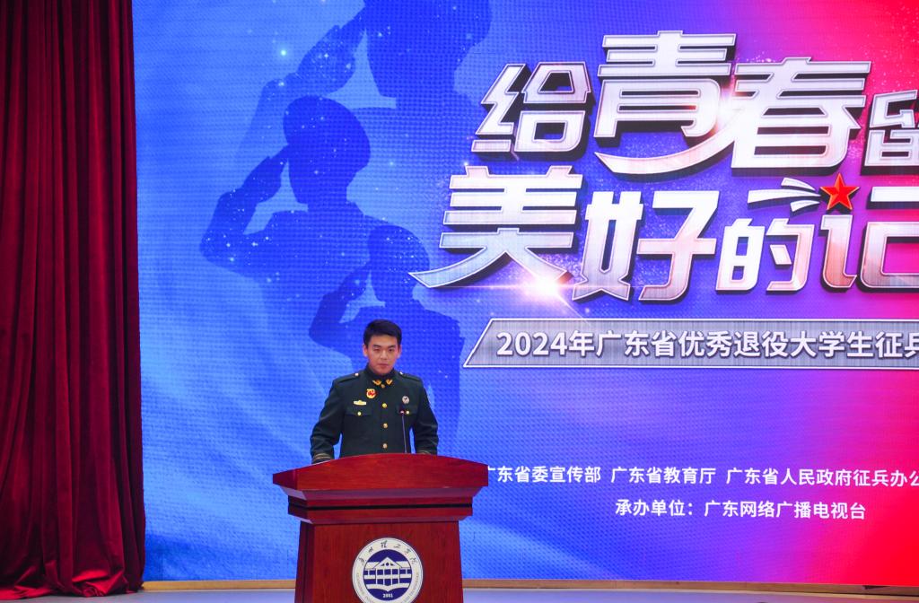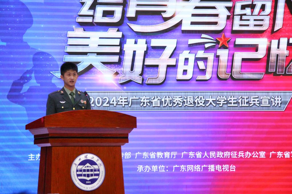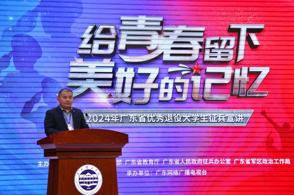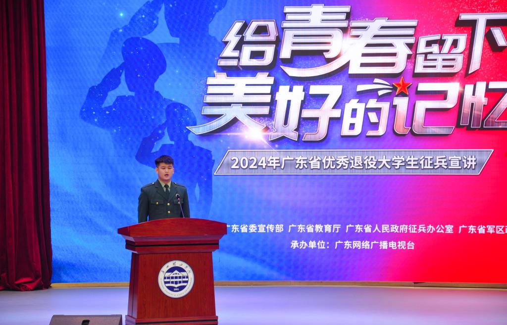 (钱林 李雨鸿)为积极响应国家号召,帮助大学生了解、掌握应征入伍政策,激发大学生报效祖国、应征入伍的热情,做好大学生征兵入伍宣传动员工作,11月15日晚,由中共广东省委宣传部、广东省教育厅、广东省人民政府征兵办公室、广东省军区政治工作局主办,广东网络广播电视台承办的“给青春留下美好的记忆”2024年广东省优秀退役大学生征兵宣讲第一站走进beat365在线唯一官网,在beat365在线唯一官网1号报告厅举行。广东省军区动员局参谋盛夏,beat365在线唯一官网党委书记黄圣诚,beat365在线唯一官网副校长张志红,省征兵宣讲团成员和beat365在线唯一官网优秀退役大学生代表出席活动。beat365在线唯一官网党委人民武装部老师和学生代表500余人参加活动。beat365在线唯一官网副校长张志红主持宣讲会。