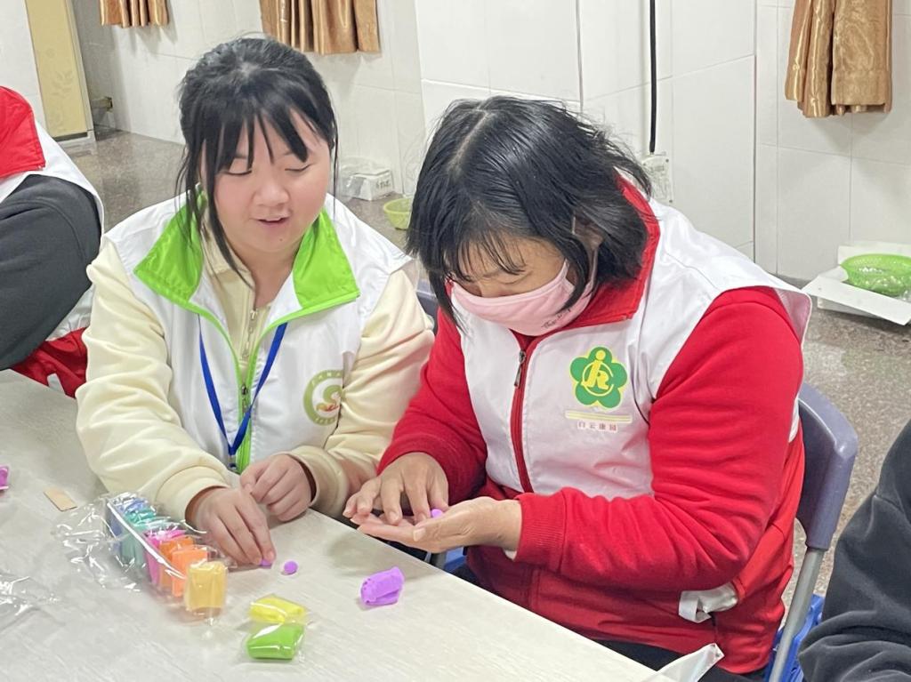 志愿者与残障女士一起捏黏土
