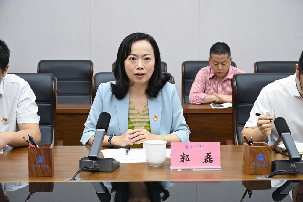 签约仪式开始前,陈朝阳部长对郭磊部长一行表示热烈欢迎。广东技术师范大学美术学院党委书记钟健雄、管理学院许素美老师就党建工作经验作了专题报告。广东技术师范大学党委常委、组织部部长郭磊在讲话中充分肯定了beat365在线唯一官网在党建工作取得的成绩,并提出进一步做好党建工作的目标任务和工作要求。
