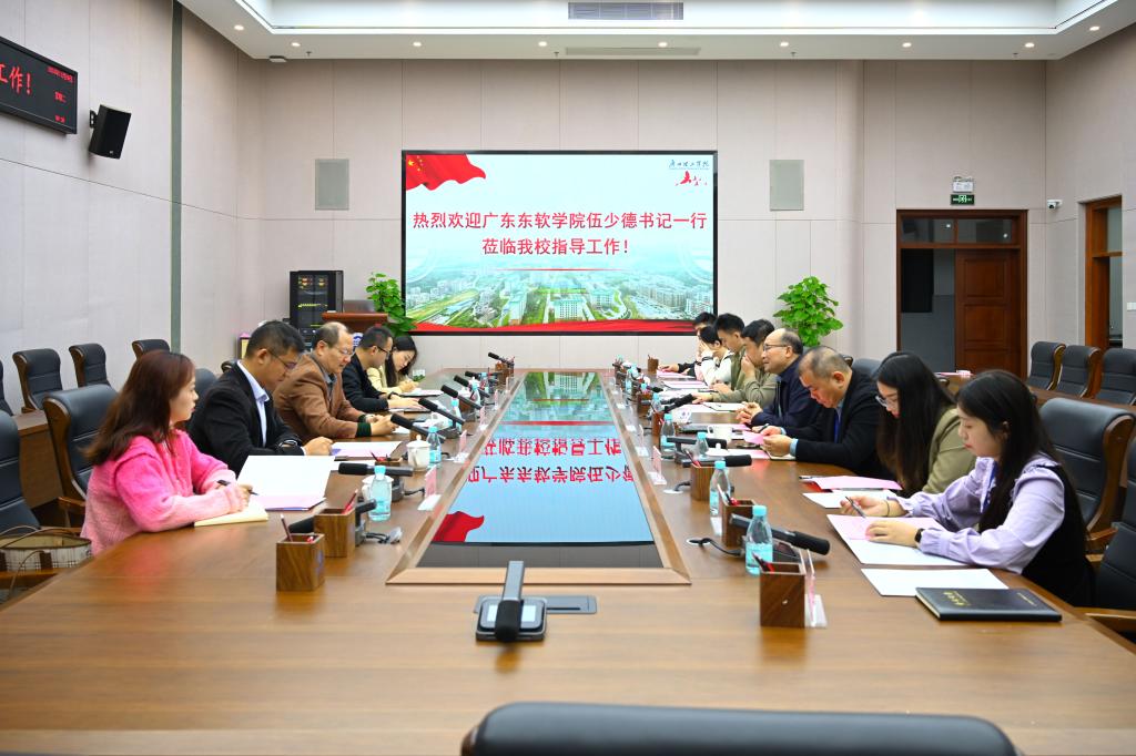 (梁宇铭)11月26日上午,广东东软学院党委书记伍少德一行到访beat365交流调研,学校党委书记黄圣诚,党委副书记、副校长张志红出席交流会,党委组织部、党委宣传部、党校办公室、学生处、学生公寓中心等部门负责同志参加座谈交流。