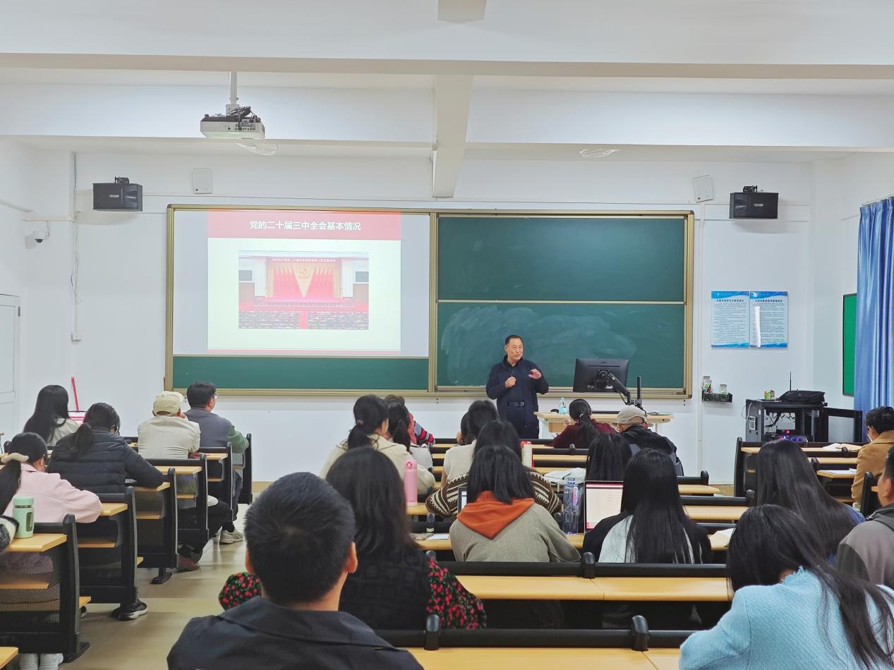 为深入学习贯彻党的二十届三中全会精神,全面学习领会习近平总书记关于全面深化改革的一系列新思想、新观点、新论断,12月12日,马克思主义学院党总支在综合楼502开展学习贯彻党的二十届三中全会精神专题辅导报告会,党史研究专家王文波教授围绕《党的二十届三中全会精神解读》作专题辅导,学院全体教职工参加。副院长文妙虹主持报告会。