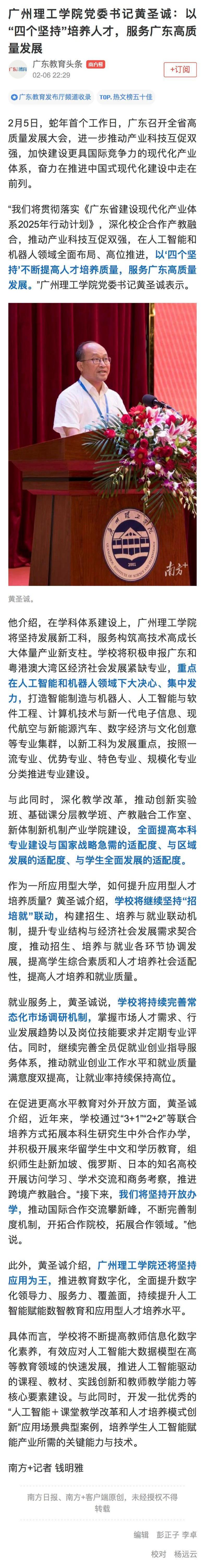 2月5日,广东省委、省政府召开全省高质量发展大会,进一步推动产业科技互促双强,加快建设更具国际竞争力的现代化产业体系,奋力在推进中国式现代化建设中走在前列。beat365党委书记黄圣诚接受南方日报采访,介绍beat365在线唯一官网助力广东高质量发展举措。他表示,我们将贯彻落实《广东省建设现代化产业体系2025年行动计划》,深化校企合作产教融合,推动产业科技互促双强,在人工智能和机器人领域全面布局、高位推进,以“四个坚持”不断提高人才培养质量,服务广东高质量发展。