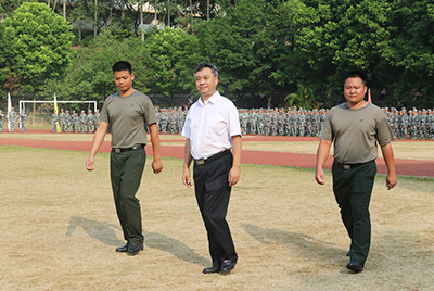 王玉潜校长在军训团首长陪同下检阅受训队伍。同学们以嘹亮的口号、严整的军容、挺拔的身姿向学校领导和部队首长致意,一声声“为学校争光”回荡在金秋的校园。