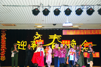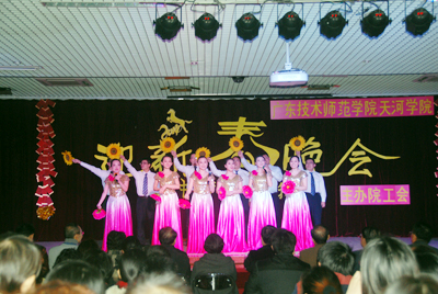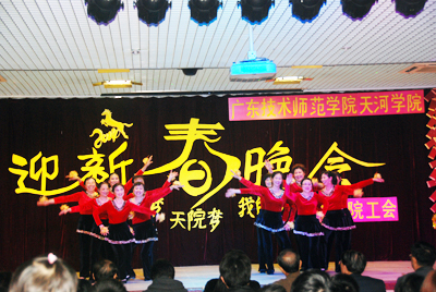 晚会亮点纷呈,最大的新意在于学院的科学发展鼓舞人心,教职工参与热情高涨,各分工会准备充分,组织出色,“中国梦,天院梦,我的梦”成为主旋律。外语系一改过去凭借女教师多、舞蹈取胜的风格,推出了小品《砖家来了》,赢得满堂彩;管理系推出歌舞《新贵妃醉酒》,男教师反串贵妃,歌声柔媚,舞姿曼妙;机电工程系一则配音滑稽表演《手舞足蹈》令人耳目一新。学院工会组织的由教工家属们主演的广场舞展现出一个欣欣向荣的和谐校园——学院事业稳步发展,教工福利年年提升,广大教职工对美丽的天河学院从情感上产生了归属感和认同感。