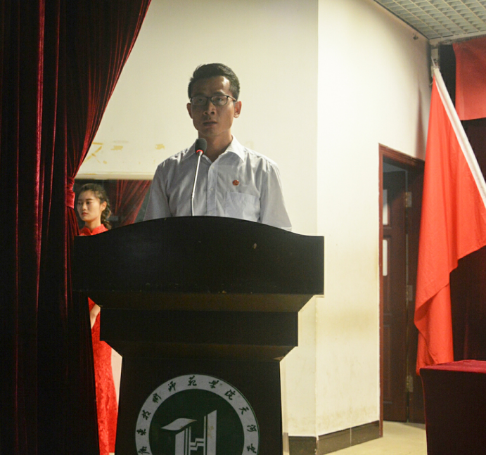 新任学生会主席曾耀南发表就职宣讲,对学生会未来一年的工作给予展望,积极倡导校学生要进行自我管理、自我服务、自我教育,自我监督,创造良好的学习、生活环境,坚持从同学中来到同学中去,密切联系、服务广大同学,并从第十五届校学生会主席刘锐填手中接过学生会会旗,带领全体新任干部在团旗下宣誓。