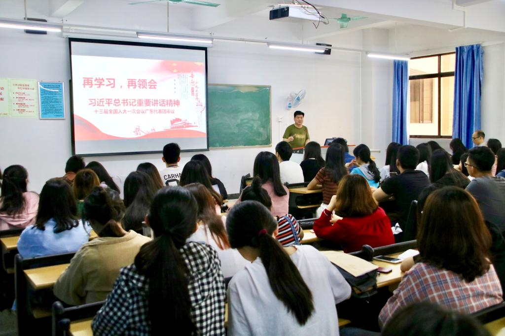 党总支书记谭飞在学习会上发表了以“再学习、再领会”为主题的讲话,解读了习近平总书记在参加十三届全国人大一次会议广东代表团审议时的重要讲话精神。谭飞书记强调,全院党员同志要在前一阶段学习领会的基础上再学习、再领会,提高政治站位,深刻领会总书记重要讲话的丰富内涵和实质精神,始终在思想上政治上行动上以习近平同志为核心的党中央保持高度一致。