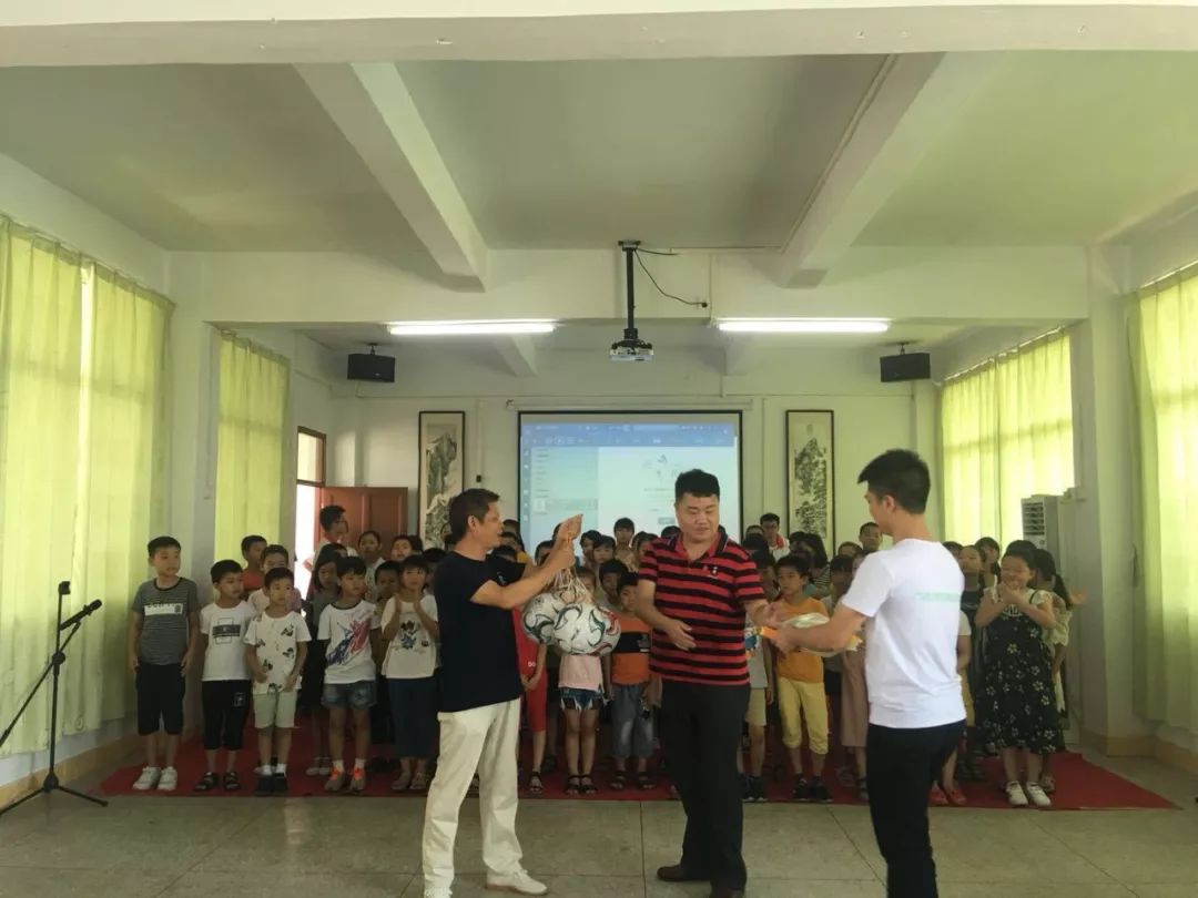 在三个教学班的成果展示结束后,陈朝阳代表学校向圩脚小学进行了物资捐赠仪式。捐赠的物资有足球、练习册以及手工物理实验道具。
