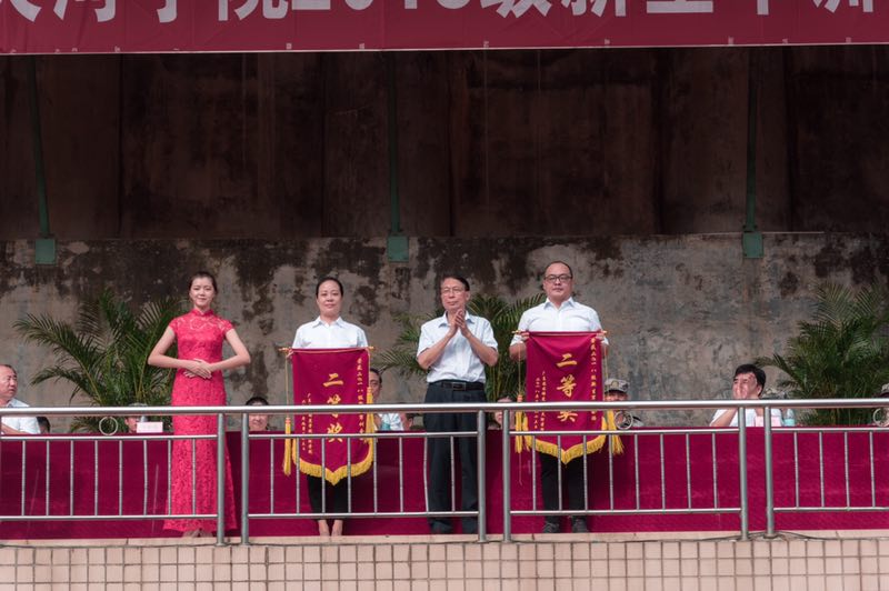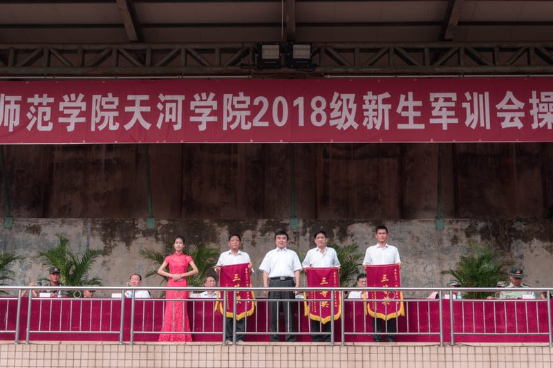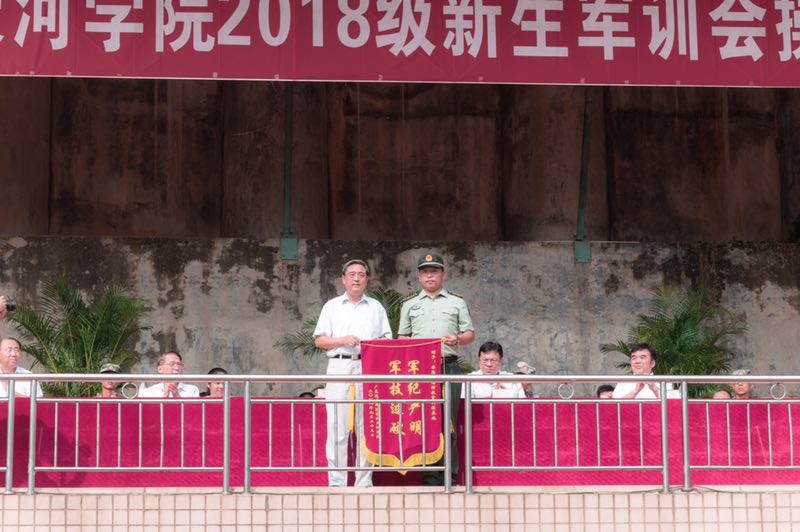 2018级新生军训会操暨总结大会在胡社军校长向承训单位赠送锦旗的掌声中谢幕。