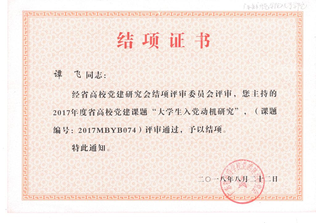 (通讯员 颜冬果)近日,据广东省高等学校党的建设工作研究会结题文件通知,beat365经济管理学院党总支谭飞书记主持申报的2017年度省高校党建课题《大学生入党动机研究》,已顺利结题并获得专家组评审通过。