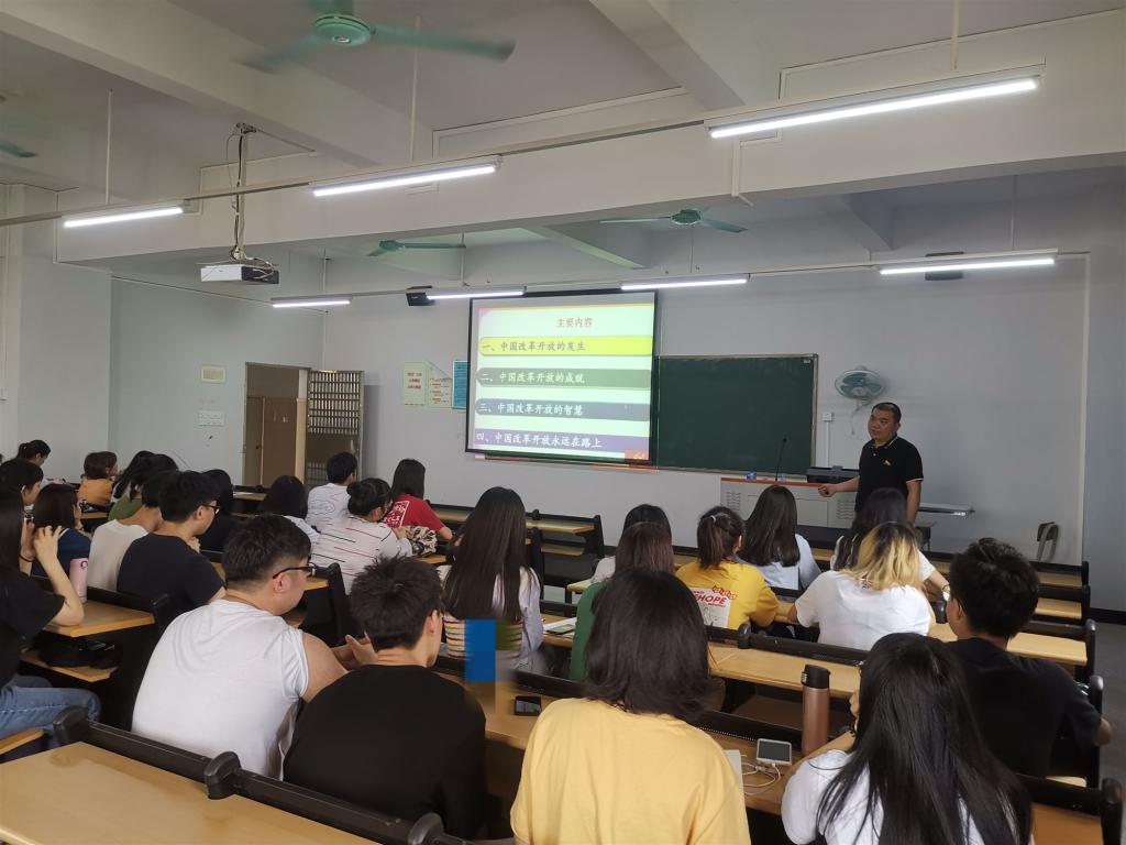 谭飞书记围绕《学习习近平总书记在庆祝改革开放40周年大会上的重要讲话精神》的主题,回顾广东改革开放的精彩画面,讲解了40年改革开放的10个“始终坚持”,阐明了这40个年头以来改革开放的经验和启示。在课上,同学们深刻感受到广东改革开放的辉煌成就和40年来“大潮起珠江”的峥嵘岁月,更加坚定新时代改革开放再出发的信心和决心。