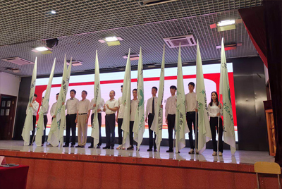 胡校长和黄书记分别为11支即将参加大学生暑期社会实践的队伍授旗。
