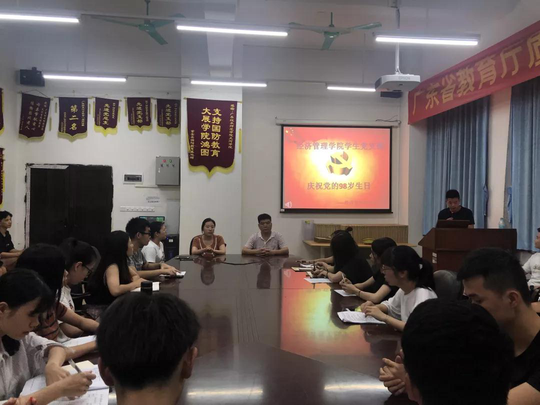 (通讯员 何倩怡、罗润彬)7月1日下午,为庆祝中国共产党成立98周年,继承和发扬党的优良传统和作风,营造拚搏进取、创先争优的浓厚氛围,经济管理学院党总支组织师生党员50余人在11栋108会议室召开庆“七一”专题组织生活会。经济管理学院党总支书记谭飞、学生第二党支部书记张宁、学生第一党支部书记钟月月出席。
