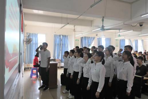 大会在斗志昂扬的国歌声中拉开序幕,全体成员起立,奏唱国歌。江亲狮同志带领第32期预备党员进行入党宣誓,每位同志都庄严地注视着入党誓词,进行宣誓仪式。