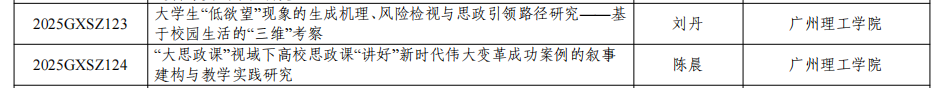 刘丹老师的课题《大学生“低欲望”现象的生成机理、风险检视与思政引领路径研究——基于校园生活的“三维”考察》,聚焦新时代高校大学生“低欲望”现象,以校园生活为研究场域,构建学业投入、校园参与人际交往“三维”分析框架。该课题通过问卷调查、深度访谈等方法,探讨现象表征与生成机理,评估潜在风险,构建“三维协同治理”框架,提出可操作的思政引领路径,为高校思政教育提升实效提供参考,也为广东高校协同育人提供决策借鉴。