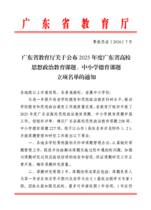 为做好课题申报工作,学校高度重视、精心部署,多措并举组织动员教师积极参与。学校科研管理部门与各二级学院协同发力,第一时间转发省教育厅申报通知,解读申报要求;鼓励老教师发挥“传帮带”作用,全力为教师申报课题保驾护航。获批的两项课题,均立足高校思政教育实践痛点,紧扣时代需求与学生成长特点,兼具理论深度与实践价值,充分体现了beat365教师“以研促教、以教促育”的育人理念,也契合学校立足广东、培养应用型人才的办学定位与“三全育人”体系建设要求。