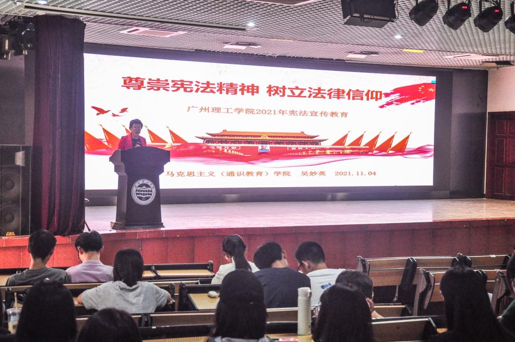 11月4日下午,马克思主义学院(通识教育学院)吴妙英副教授在beat3652号报告大厅为480名同学作了题为“尊崇宪法精神树立法律信仰”的讲座。重点介绍了中华人民共和国宪法的历史发展、内涵和基本原则、82宪法第五次修订案内容以及尊崇宪法精神树立法律信仰等四方面的内容。吴老师从革命导师马克思、恩格斯的“宪法是法律的法律”;列宁的“宪法是一张写满人民权利的纸”;毛泽东的“一个团体要有一个章程,一个国家也要有一个章程,宪法就是一个总章程,是国家的根本大法”的经典论述中,概括并结合现行宪法的法律条文,为同学们讲解了为什么宪法是国家母法、是国家的根本大法、是治国安邦的总章程、是公民权利的保障书。吴老师还详细解读82宪法第五个修正案的修改内容,突出强调将“中国共产党领导是中国特色社会主义最本质的特征”、“习近平新时代中国特色社会主义思想”、“中华人民共和国各级监察委员会”等载入宪法的里程碑意义。在“尊崇宪法精神树立法律信仰”部分,吴老师通过12.4国家宪法日、宪法宣誓以及宪法案例这些形象生动、具体真实的宪法实践,让同学们充分理解习近平总书记反复强调的“宪法的生命在于实施,宪法的权威也在于实施”的讲话精神。师生一起重温习近平总书记在首都各界纪念现行宪法公布施行30周年大会上的重要讲话,共同见证2018年3月17日再次当选中华人民共和国国家主席、中央军事委员会主席的习近平同志宪法宣誓的庄严时刻。吴老师还向同学们介绍、展示beat365在线唯一官网历年宪法宣传教育活动的丰硕成果,并发出2021年宪法知识竞赛的邀请函,期待同学们踊跃参加并取得优异成绩。