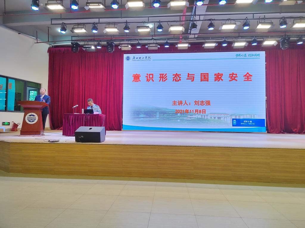 11月8日,学校举办意识形态与国家安全专题报告会,中共广州市委国安办国家安全宣传教育讲师、广州市公安局白云区分局刘志强大队长应邀作辅导报告。讲座列入学校秋季学期“三全育人素质教育周”专题内容,受到师生热烈欢迎,师生代表700余人参加了报告会,讲座由党委副书记、副校长肖海主持。