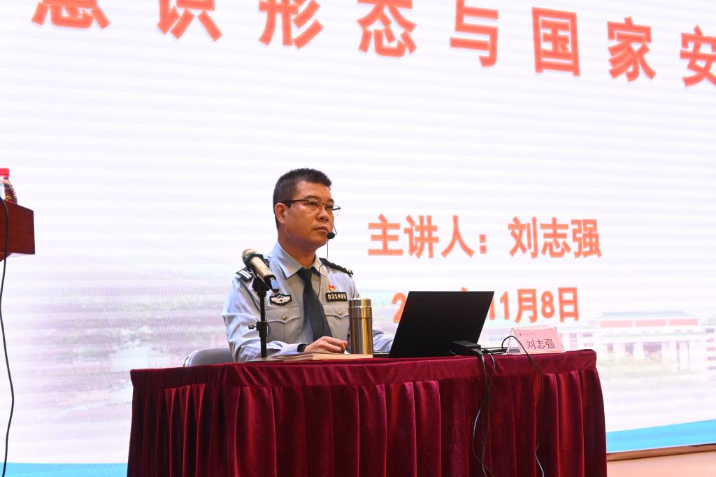 刘志强围绕《我们的路--意识形态与国家安全》主题,从习近平总书记关于意识形态的系列重要讲话和指示精神入手,围绕当前意识形态和国家安全所面临的挑战和如何应对展开了论述。刘队长从我们的意识形态、目前面临的风险和危险、我们的路等方面深入浅出阐释了当前意识形态和国家安全工作的重要性。报告通过一系列详实的数据分析和典型案例解读,介绍了当前国家安全和社会政治稳定形势,阐述了国际综合实力变化情况,从国际关系入手深入解读了国家层面以及高校层面的社会稳定形势。