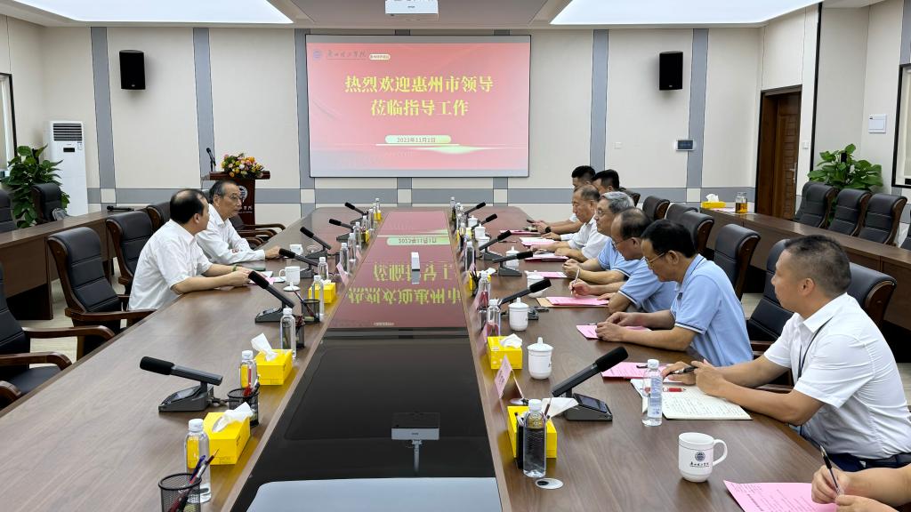 校长胡社军代表学校致欢迎辞,并感谢惠州市委市政府长期以来对学校的关心和支持。党委书记黄圣诚汇报了惠州博罗校区党建工作开展情况。党委副书记、副校长肖海向调研组详细汇报了惠州博罗校区的建设情况,从校园建设、教学资源、学科专业、服务保障、管理运行、教师队伍等方面谈新校区办学特色和产业学科布局,从可持续发展思路、产教深度融合、校企协同育人、服务地方经济等方面谈学校高质量发展。