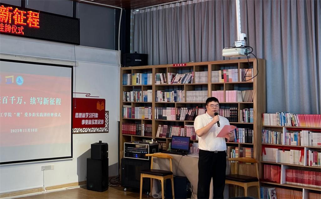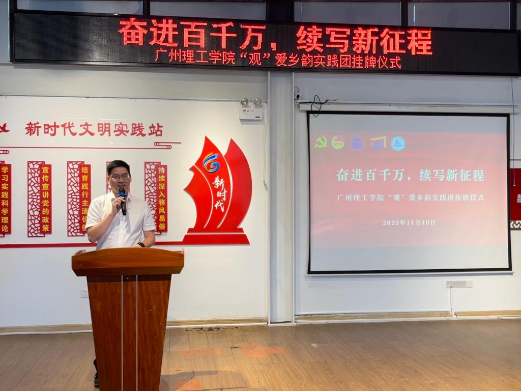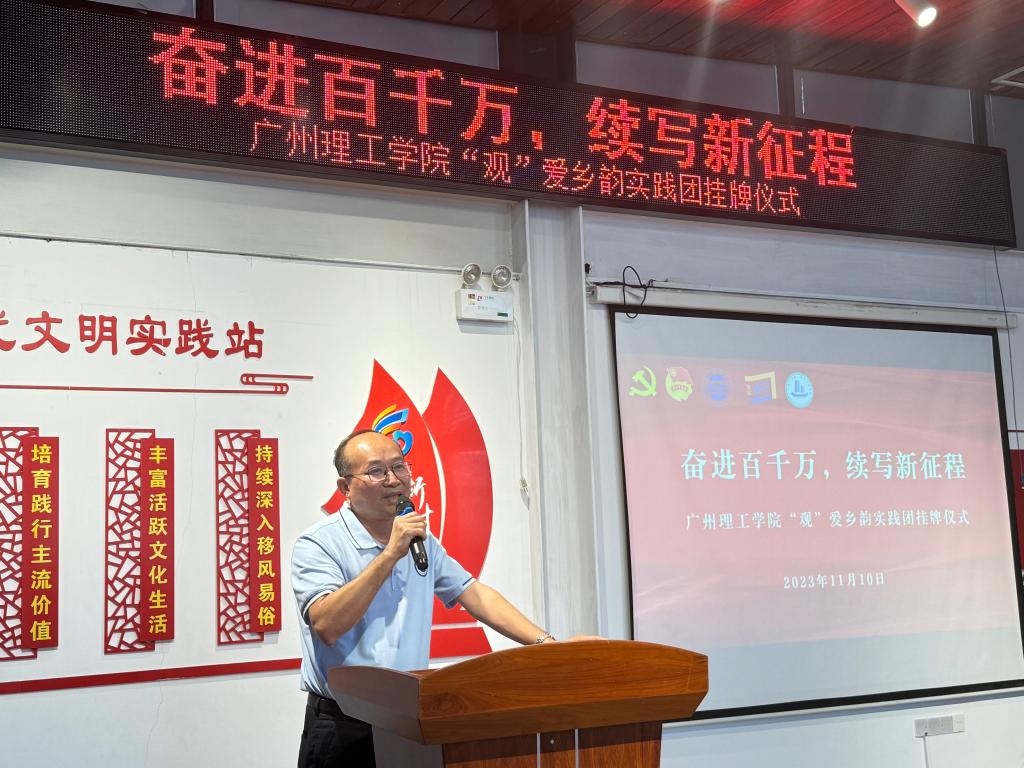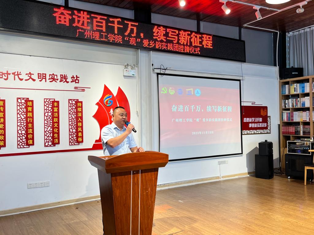 (阴凡 梁宇铭)11月10日下午,广东青年大学生“百千万工程”突击队行动项目beat365在线唯一官网“观”爱乡韵实践团在惠州市博罗县罗阳街道观背村回顾展示了暑期社会实践活动成果,并举行挂牌仪式。共青团博罗县委副书记朱懿,罗阳街道办副主任、团工委书记林康健,观背村党支部书记郑国雄,beat365在线唯一官网党委书记黄圣诚,党委委员、副校长张志红出席活动,beat365在线唯一官网党委工作部副部长陈朝阳,建筑工程学院党总支副书记阴凡、团委副书记林国健以及“观”爱乡韵实践团主要成员参加了仪式并作交流。