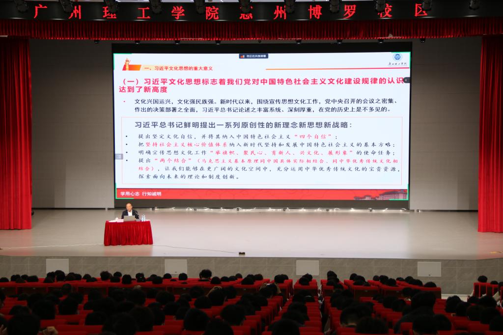 黄圣诚书记讲授了题为《深入学习贯彻习近平文化思想 为强国建设凝聚强大精神力量》的专题课,以深入学习习近平总书记在新时代文化建设方面提出了一系列新思想新观点新论断为切入点,阐述了习近平文化思想的重大意义。从“观文化 守民心—深入学习领会习近平文化思想”“勇担新的文化使命 建设高水平文化强省”“让文化自信成为新时代青年的鲜亮底色”三个篇章,紧密联系实际,阐述新时代青年生逢其时、舞台广阔,在推进高质量发展中大有可为。他强调,广大青年学生要深入学习贯彻习近平文化思想,要把中华民族最深层的精神追求作为自己的人生追求,把中华文化最独特的精神标识作为自身的青春标识,传承优秀传统文化强大底气,汲取中国精神丰厚滋养,让文化自信成为新时代青年的鲜亮底色。青年学生要抓住新机遇,勇担新的文化使命,涵养向上向善、刚健朴实的文化,面向世界讲好中国故事、大湾区故事、广东故事、广州理工故事。他希望,青年学生要充分领悟根植于实践的中华优秀传统文化思想精髓,充分认同中华优秀传统文化的当代价值,坚持不忘本来、吸收外来、面向未来。即仰望历史星空,又脚踩坚实大地,让文化自信自强成为新时代青年前进的最大底气,做历史的推动者、时代的偕行者,汇聚推动中华民族勇毅前行、屹立于世界民族之林的青春力量。