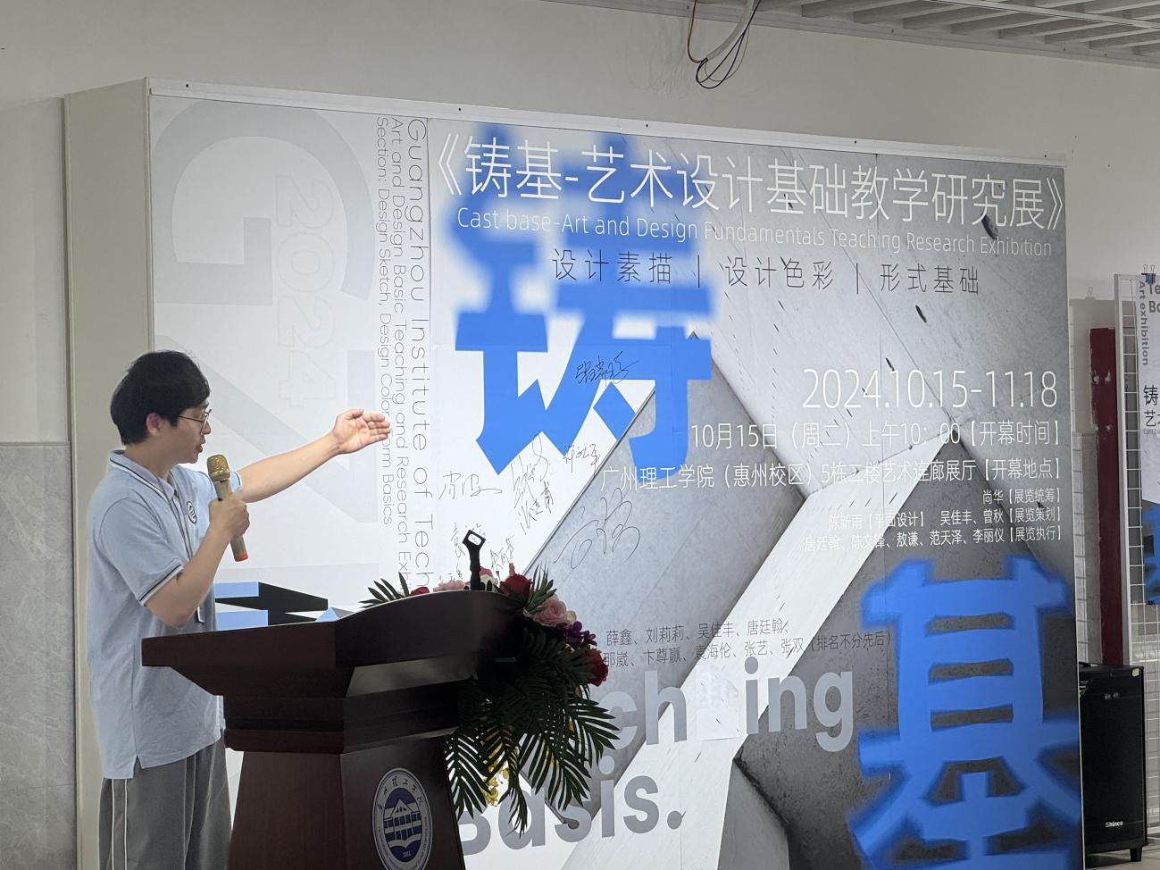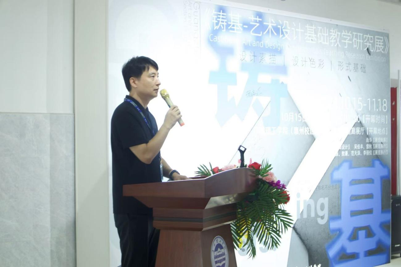 (吴佳丰)2024年10月15日早上十点钟,由艺术设计学院主办的《铸基-艺术设计基础教学研究展》开幕仪式在惠州校区隆重开幕。 学校副校长肖海,学校办公室副主任、惠州校区管委会副主任钟任鹏,武装部部长、保卫处副处长、惠州校区保卫办主任许就平,现代航空学院院长张瑞琦,惠州校区后勤办公室主任张连甫,惠州校区教学办主任袁洁贞,艺术设计学院党总支副书记颜冬果,艺术设计学院副院长方滨、副院长梁健,惠州市艺典彩玻建材有限公司销售总监金美莉等领导出席活动,艺术设计学院24级师生参加开幕式。 在创意无限、多元并进的时代,艺术设计基础课程展览成为探索艺术教育新境界的重要窗口。本次展览由艺术设计学院基础教研组教师团队精心策划,展示了23级学生180多件设计素描、设计色彩、形式基础等基础课程优秀作业以及多项获奖作品。 展览中,设计素描作品细腻生动,学生们通过巧妙的笔触和构成设计,将平凡物象转化为艺术设计感十足的画面,探讨人与自然、科学与未来等叙事命题。设计色彩作品色彩斑斓、对比鲜明,展现了学生们对色彩的敏锐感知和大胆构成尝试。形式基础作品则运用点、线、面等基本造型元素,构建出富有节奏和韵律的画面,实验材料与形式语言的特殊结合更是令人眼前一亮。 这些作品不仅体现了艺术设计基础的研究性,更彰显了其学科应用性。基础教学为学生们提供了坚实的理论基础和广阔的实践空间,培养他们既有深厚理论素养,又有较强实践能力。 此次展览不仅全方位地呈现了艺术设计基础教育所取得的成果,更深刻地揭示了基础教育不可替代的价值。鉴于当前学科间融合、设计专业跨界融合的趋势,艺术设计学院致力于推行共享的基础课程体系,着重培养学生的“人文情怀”与自我认知,引领他们探索更加宽泛且综合的艺术设计理念。通过激发知识创新与启迪智慧,该展览为塑造具备扎实素养与基础能力的艺术设计人才奠定了基石。 副校长肖海讲话 艺术设计学院副院长梁健发言 展览策划人吴佳丰老师发言 展览开幕现场