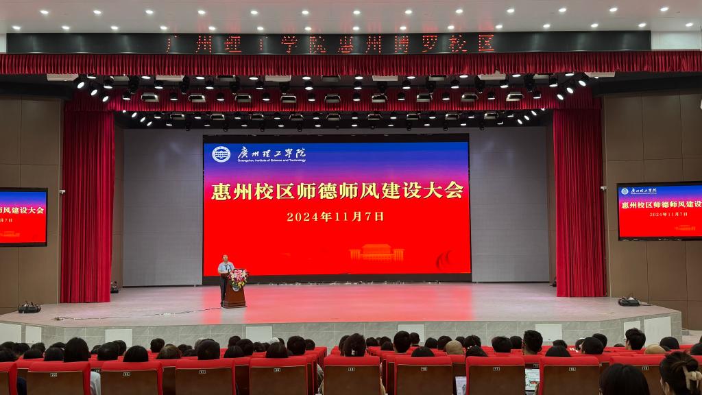 (梁宇铭)11月7日下午,惠州校区在大礼堂召开师德师风建设大会,进一步落实习近平总书记对新时代教师队伍建设的系列重要指示批示精神,全面提升教师队伍的师德师风水平,营造尊师重教的良好氛围。学校副校长肖海出席会议并讲话,惠州校区管委会与各部门负责同志、常驻惠州二级学院领导、惠州校区全体常驻教职工参加会议。会议由惠州校区管委会副主任钟任鹏主持。